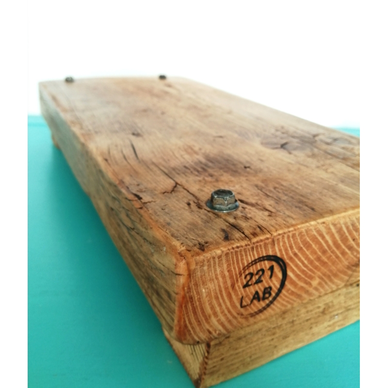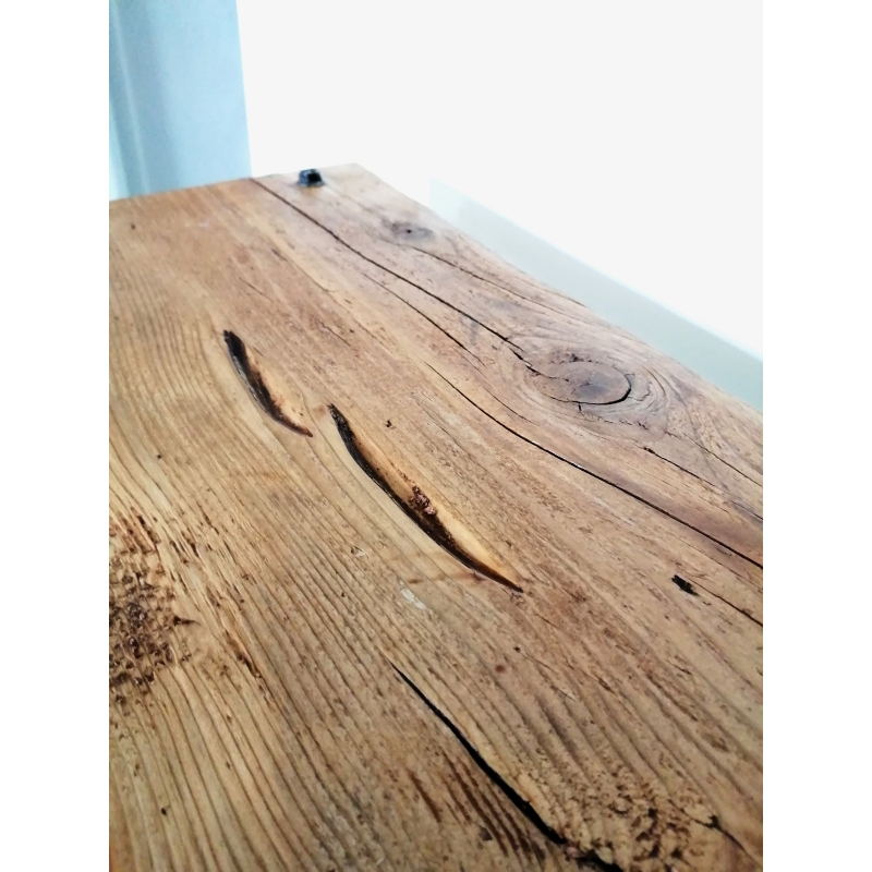 It uses old woods recovered from mason's scaffolding. the wood has been brushed and worked in such a way that the veins, cracks and knots remain visible and perceptible to the touch. With its water-based finish and natural beeswax, it stays smooth and easy to clean.