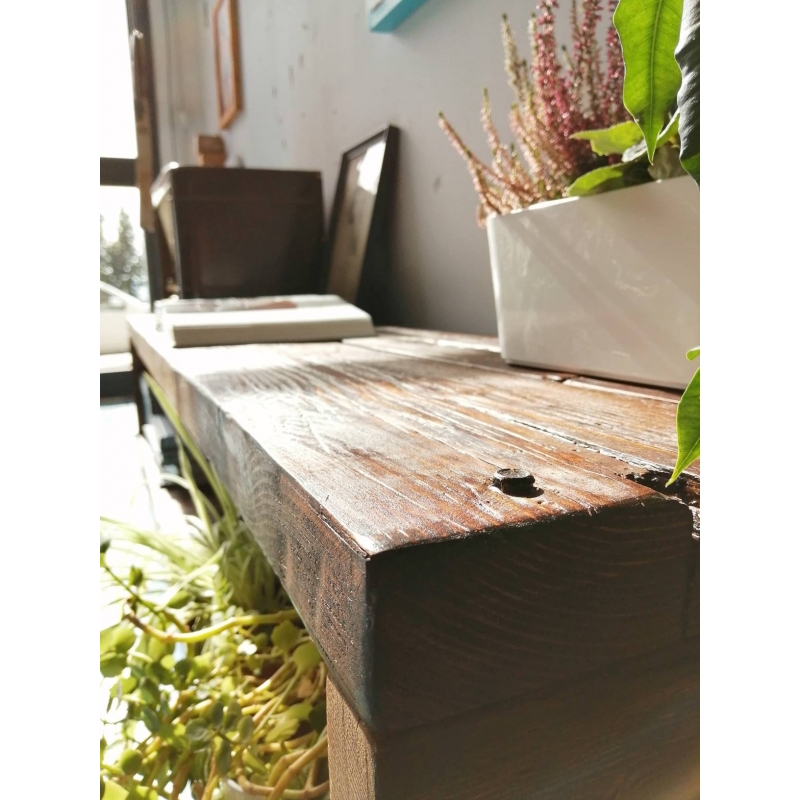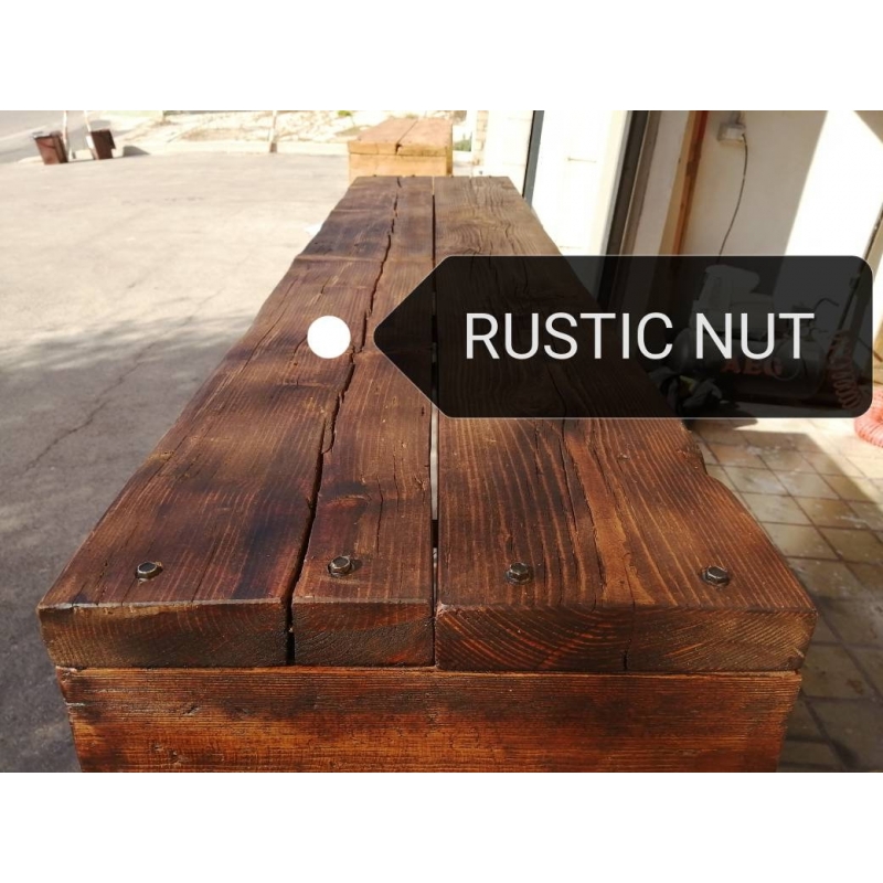 Old wood brushed and worked in such a way that the veins, cracks, knots and old nail holes remain visible and perceptible to the touch but with its water and natural beeswax finish, it remains smooth and easy to clean.