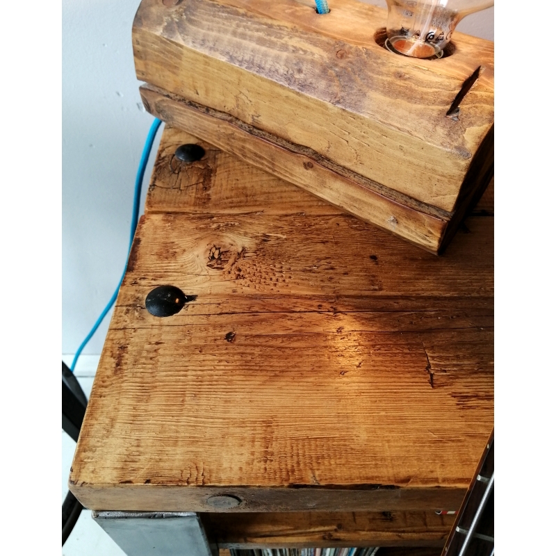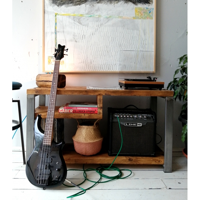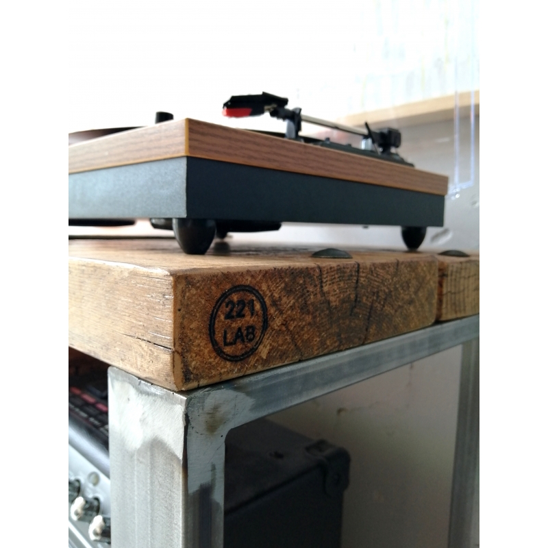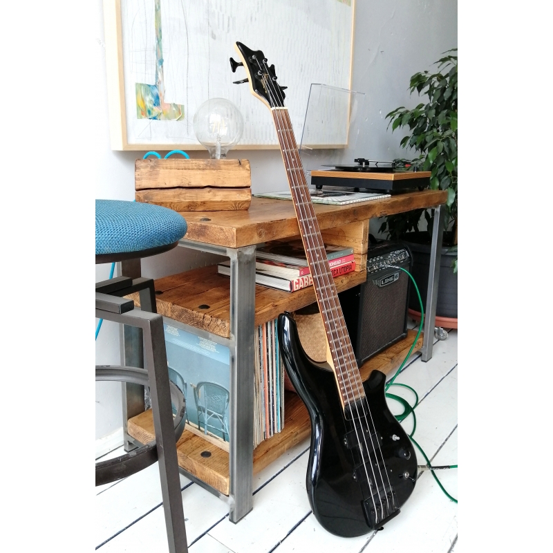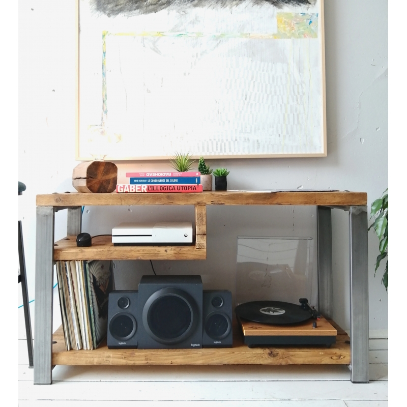 Mobile per giradischi e raccolta vinili e amplificatore, mobile tv media console, mobile ingresso realizzato con legni di recupero e struttura in ferro.