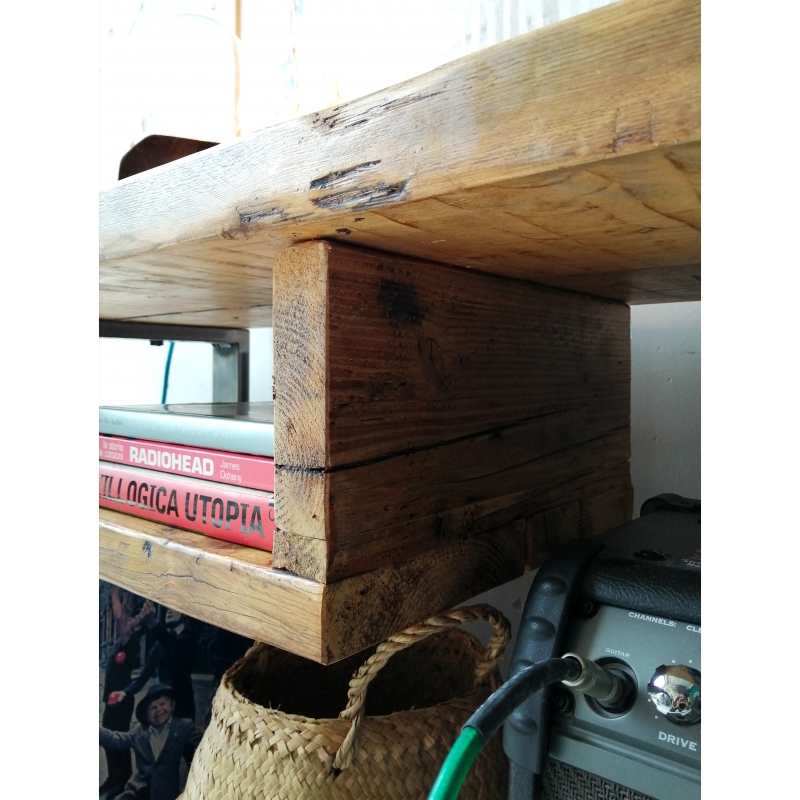 Il 221lab è orgoglioso di progettare e realizzare i nostri prodotti con processo artigianale, dal ferro al legno, tenendo a mente l'originalità del prodotto di recupero. Ogni tavola è stata recuperata ,spazzolata in modo tale che le venature, le vecchie spaccature, nodi e vecchi buchi dei chiodi rimangano a vista e percettibili al tatto. Ogni tavola ha una finitura di colore a base d'acqua ecologica e una finitura a cera d'api. La struttura in ferro è prodotta da artigiani locali ed è in tubolare da 6 cm x 2 cm.