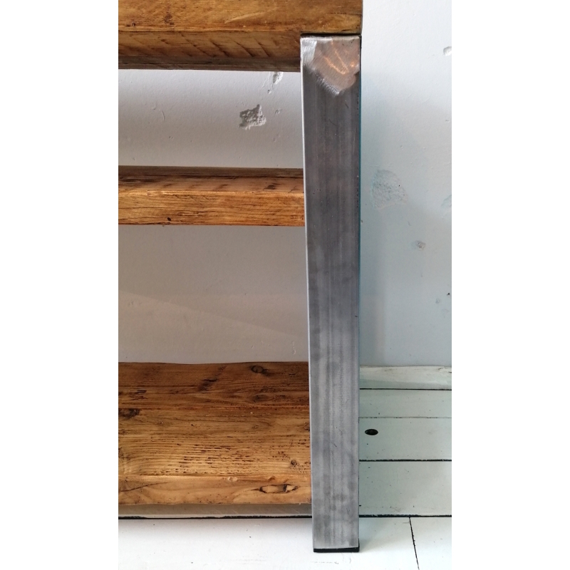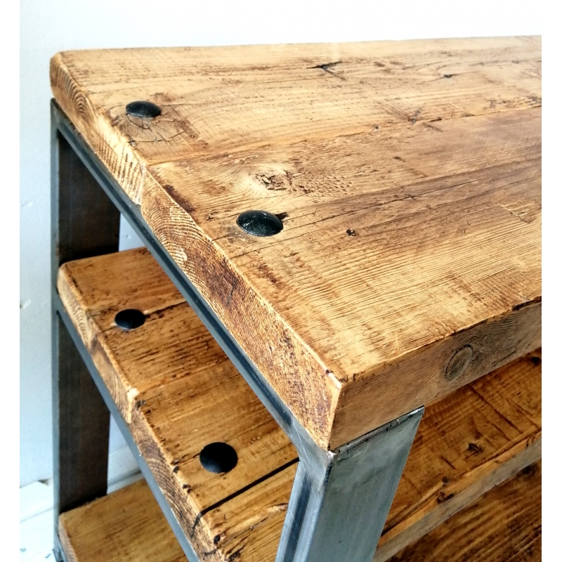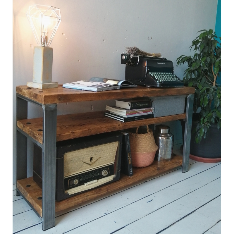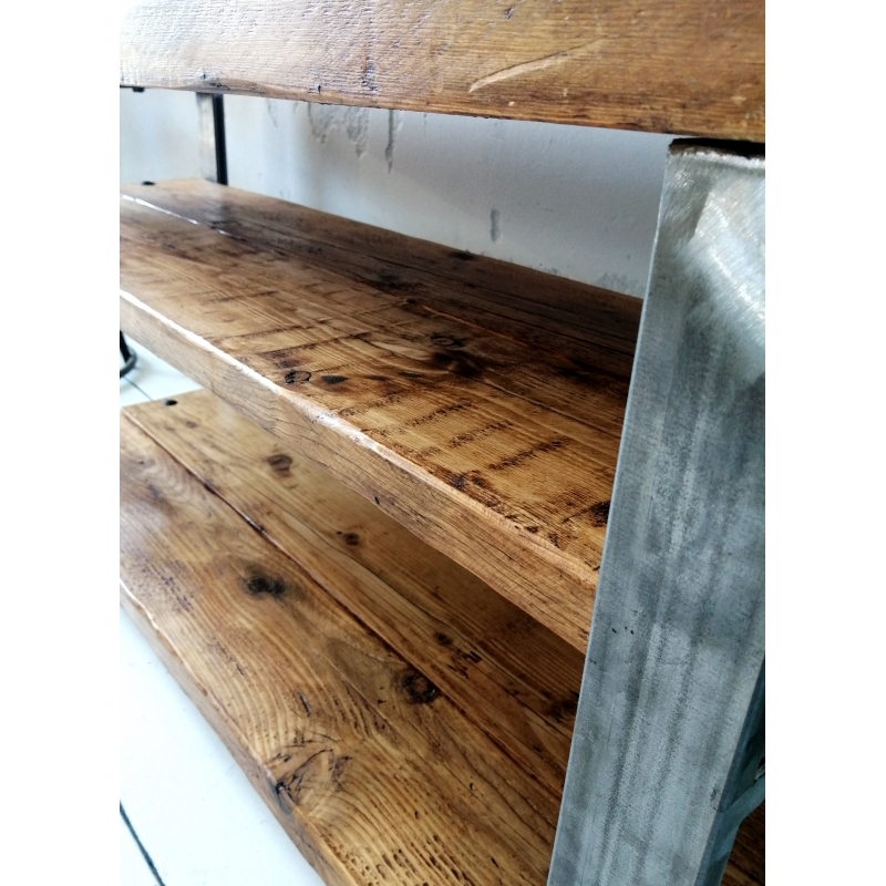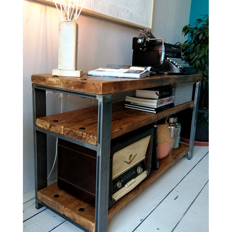 Mobile per giradischi e raccolta vinili e amplificatore, mobile tv media console, mobile ingresso realizzato con legni di recupero e struttura in ferro.